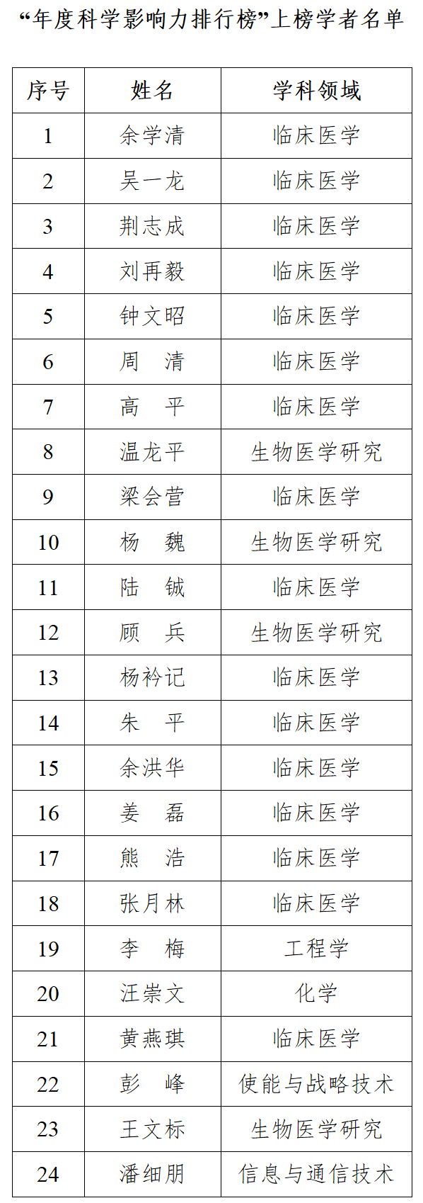 今年,广东省人民医院有4人入选“终身科学影响力排行榜”,24人入选“年度科学影响力排行榜”。其中,余学清、吴一龙、杨魏3人同时入选“终身科学影响力排行榜”和“年度科学影响力排行榜”。